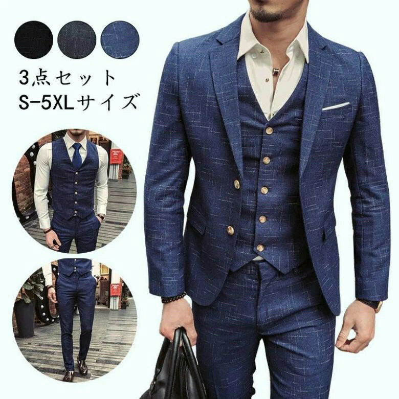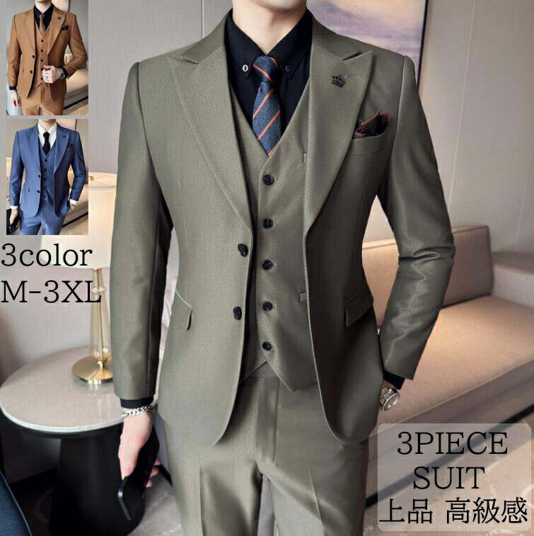スリーピーススーツ メンズ フォーマルスーツ ジャケット+ズボン+ベスト 高級感 結婚式 前撮り 花婿 上質 スタイリッシュ タキシード スリムスーツ 着?せ セットアップ 3点セット 3ピーススーツ 紳士服 お洒落 舞台 パーティー 発表会 忘年会 入学式 通勤