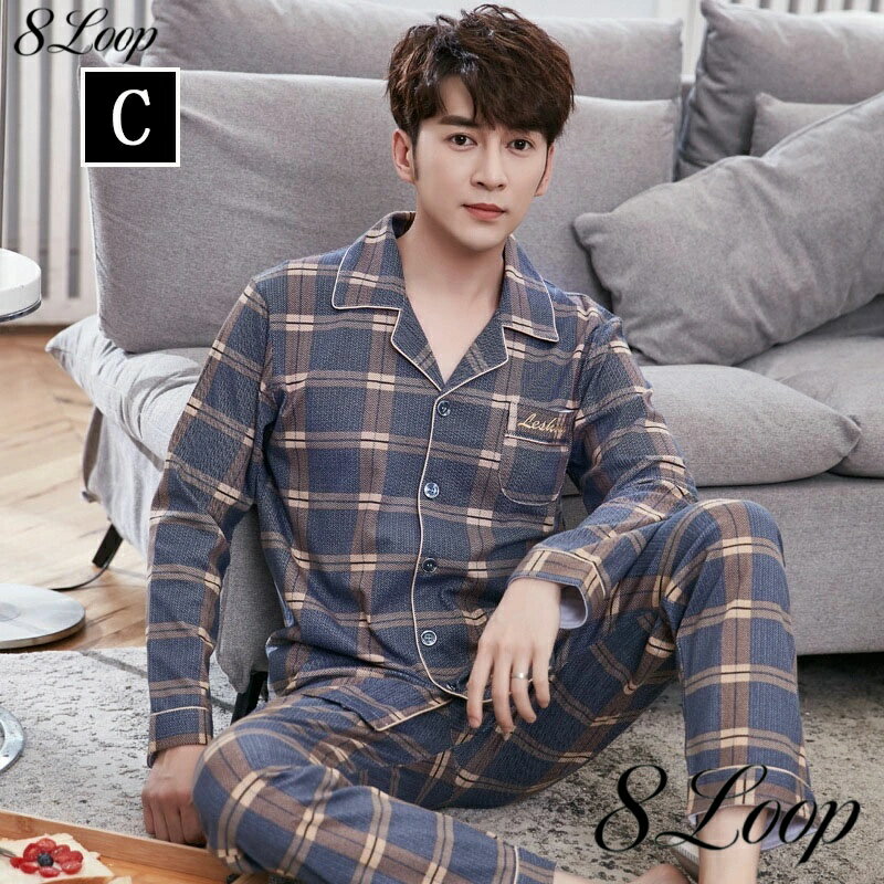 パジャマ メンズ 春秋冬 セットアップ ルームウェア 上下セット 長ズボン チェック柄 ストライプ プリント 前開き 長袖 男性用 大きいサイズ ナイトガウン 部屋着 カジュアル おしゃれ 寝巻き ナイトウェア 8タイプ M-3XL