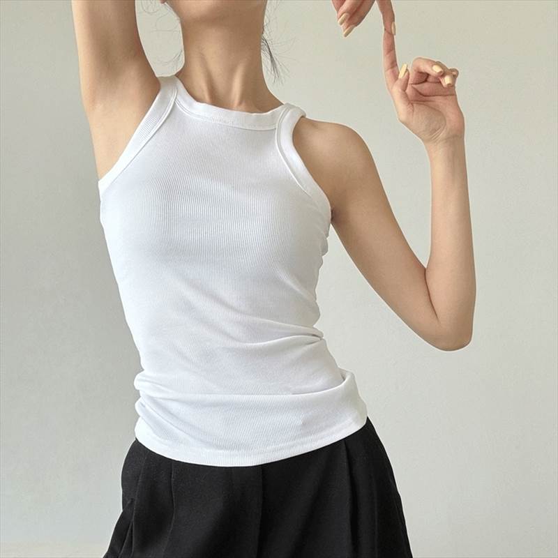 【P2倍&クーポン有】 夏コーデ レディース トップス ラウンドネック インナー Iライン カップ付き ラフ 袖なし タイト スリム きれいめ ハイウエスト リブ ストリート ノースリーブ おしゃれ 細身 ショート カジュアル シンプル 伸縮性 クロップド丈