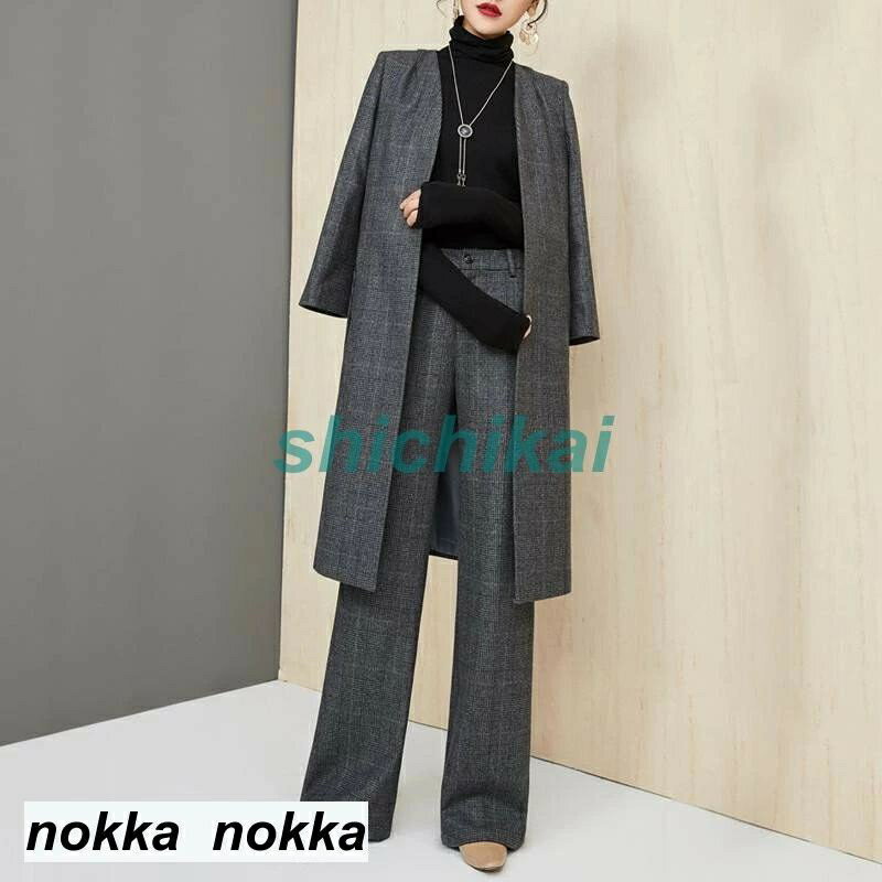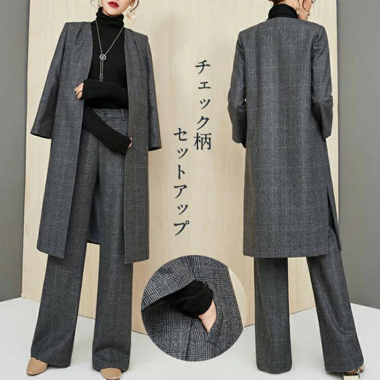 パンツスーツ レディース スーツ セットアップ チェック柄 フォーマルスーツ ジャケット ロング丈 パンツ ロング コート 長袖 フォーマル ビジネス オフィス 通勤 卒業 入園式 入学式