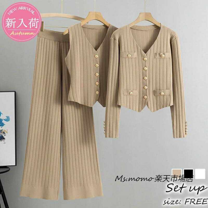 ニットセットアップ レディース 秋冬新作 ニット3点セット 長袖ニットカーディガンベストセーター ワイドパンツニットセットアップ 部屋着 カジュアル ゆったり オシャレ40代50代