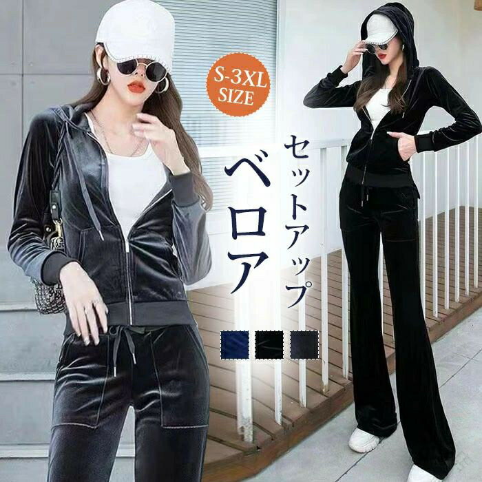 ベロア セットアップ ベルベット レディース 上下セット 高級感 春 秋冬 トレーニングウェア スポーツウェア フレアパンツ ロングパンツ 前開き フード付き カジュアル 大きいサイズ 体型カバー ルームウェア 通勤 20代 30代 40代 50代対応