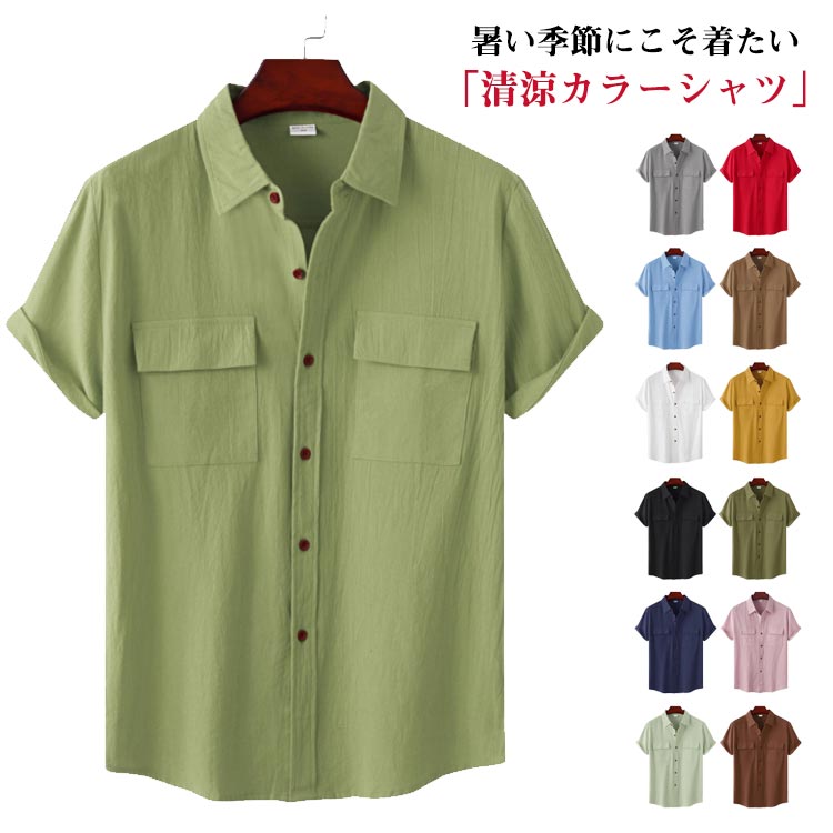 リネンシャツ メンズ 綿麻 カラーシャツ 半袖 前開き 胸ポケット 亜麻 コットンリネン 無地 夏 カジュアル スタイリッシュ 涼しい ストリート おしゃれ かっこいい 全13色