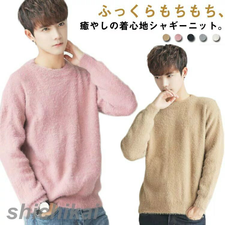 シャギーニット ニットセーター メンズ 裏起毛 厚手 長袖 トップス カジュアル クルーネック 保温 防寒 暖かい 冬 無地 全5色