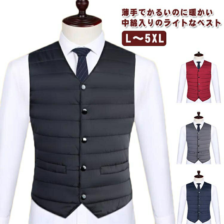 中綿ベスト メンズ ベスト 中綿 スーツベスト インナーベスト ライトベスト 前開き ポケット vネック 薄手 軽い 暖かい オフィス ビジネス アウター 秋 冬 春 防寒 対策 あったかい 無地 スーツ 仕事着 通勤 仕事用 大きいサイズ 男性 紳士服 L〜5XL 送料無料
