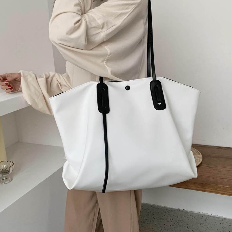 【P2倍&クーポン有】大容量 モノトーン 肩がけ 手持ち ビジネスバッグ 個性的 春 夏 秋 冬 オールシーズン バッグ カバン レディース ハンドバッグ トート 多収納 便利 自立 スクエア 四角 ボタン フェイクレザー オフィス ビジネス 大きめ 大きい 白 黒