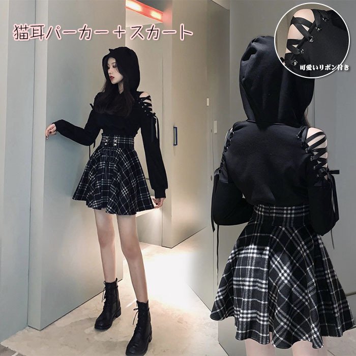 猫耳パーカー スカート 2点セット レディース ファッション 猫耳付き ショート丈パーカー 韓国系 リボン付き 黒いパーカー 格子縞 スカート