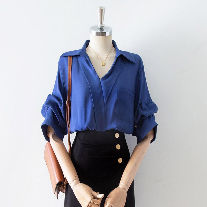 夏 クロス カラー プロ 通勤 インタビュー シャツ レトロ 半袖 ブルー レディース