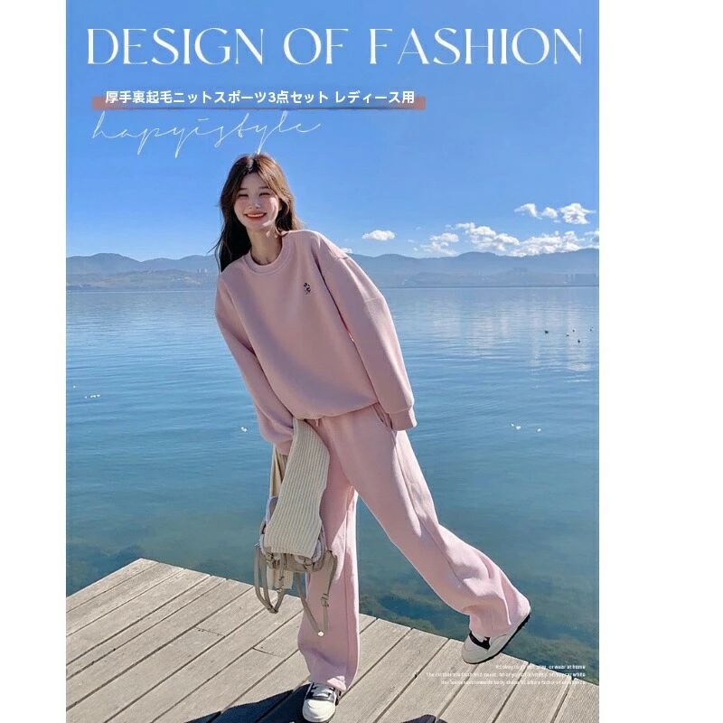 2025年春秋冬新作レディーススウェットセットアップ|加厚裏起毛トップス+ストレートパンツ|小清新×韓国風カジュアルスウェットセットアップ / レディース / 加厚 / 小清新 / ゆったり / ストレートパンツ / 2点セット /通勤・女子会・お出かけ