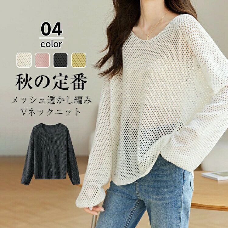 メッシュニットトップス レディース 秋 冬 長袖 Vネック ニットトップス 透かし編み ニツトトップス 薄手 肌見せ 重ね着 レイヤード く ゆったり 大きいサイズ きれいめ おしゃれ 通勤 カジュアル シンプル体型カバー 無地 送料無料