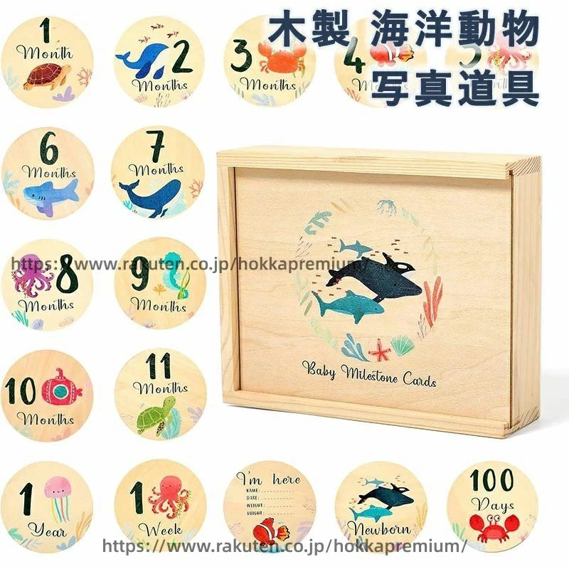 木製 写真道具 出産祝い 誕生100日 ウッド 海洋動物 ニューボーンフォト ベビーマンスリーカード 収納箱付き 天然木材 8枚セット 新生児 赤ちゃん 成長記録