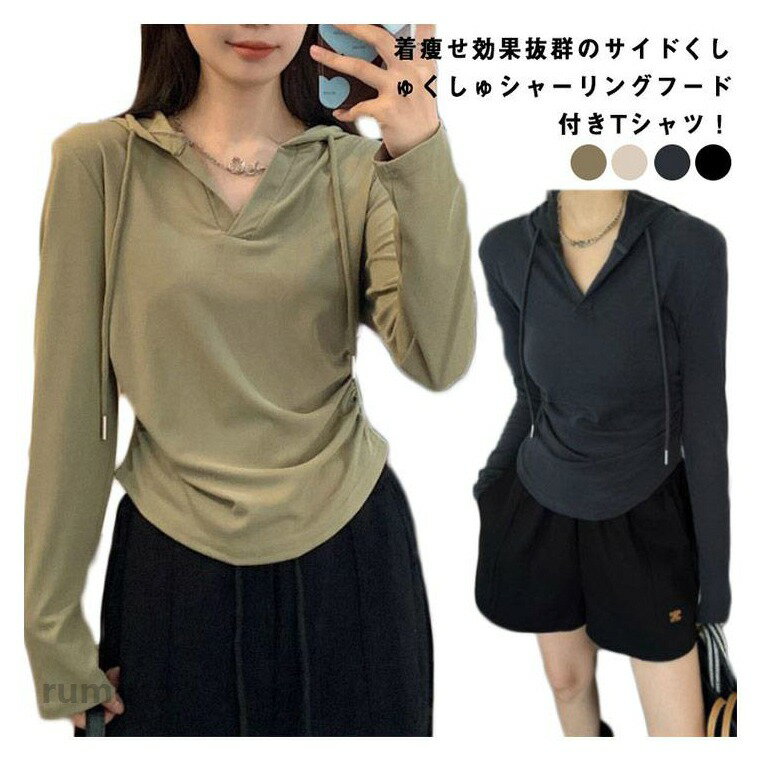 綿 Vネック レディース プルオーバー tシャツ カットソー 長袖tシャツ フード付きtシャツ ショート丈 春 アメカジ パーカー 着痩せ 春 秋 おしゃれ おしゃれ M L XL 2XL サイドくしゅくしゅシャーリング