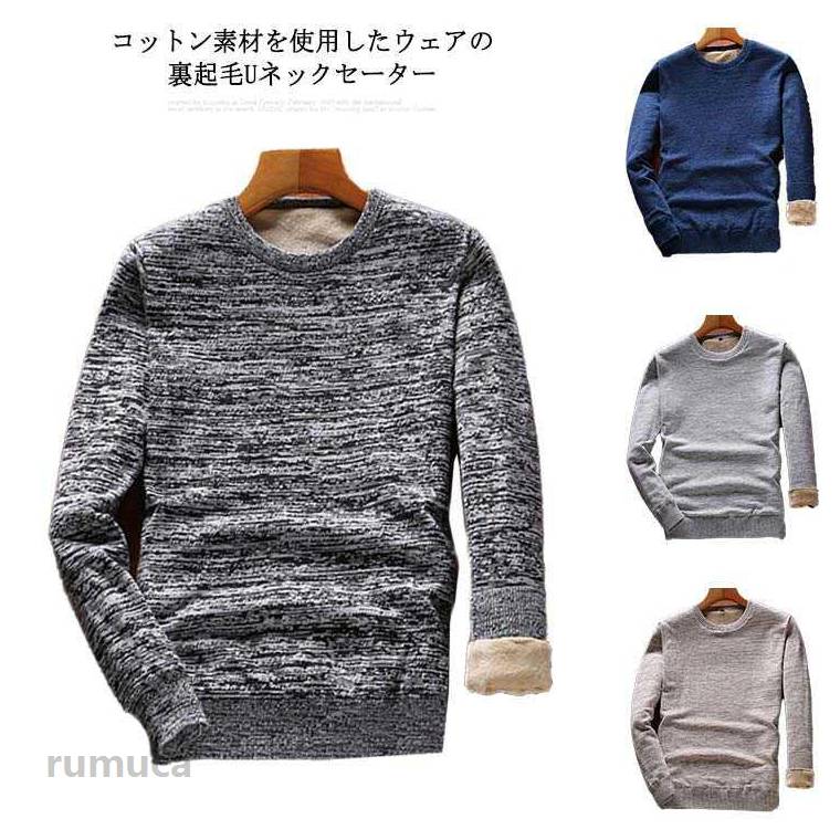 メンズ Uネック ニット 裏起毛 長袖 セーター 丸首 綿100% ビジネス オフィス カジュアル 無地 秋冬 クルーネック フリース スクールセーター 制服 シンプル 厚手 暖かい 防寒 M L 2L 3L 4L
