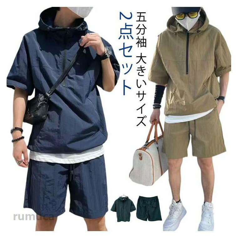 L 短パン 春 3XL 夏 ショートパンツ 夏 ハーフジップ 2点セット メンズ パーカー ストレート ビッグシルエット 半袖パーカー XL セットアップ カーゴショーツ ハーフパンツ フード付き ハイネック 2XL M カジュアル アメカジ 上下セット