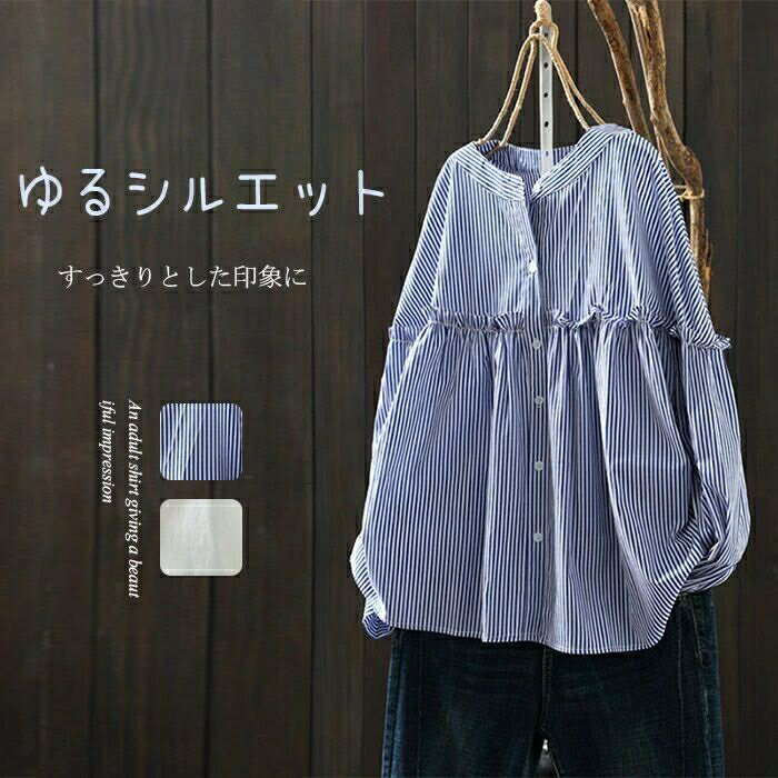 シャツ バンドカラー トップス 白シャツ 羽織る コットン 綿 フリル 綿シャツ 長袖 シャツ ストライプ 春 レディース 長袖シャツ