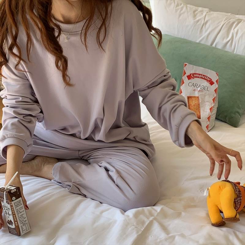 【P2倍&クーポン有】ルームウェア パジャマ 上下セット レディース 部屋着 寝巻き ナイトウェア 秋 冬 普通丈トップス 長袖 ラウンドネック 襟なし ストレート オーバーサイズ ダボダボ カラバリあり 淡色 緑 グリーン イエロー 黄色 パープル 紫色 くすみカラー