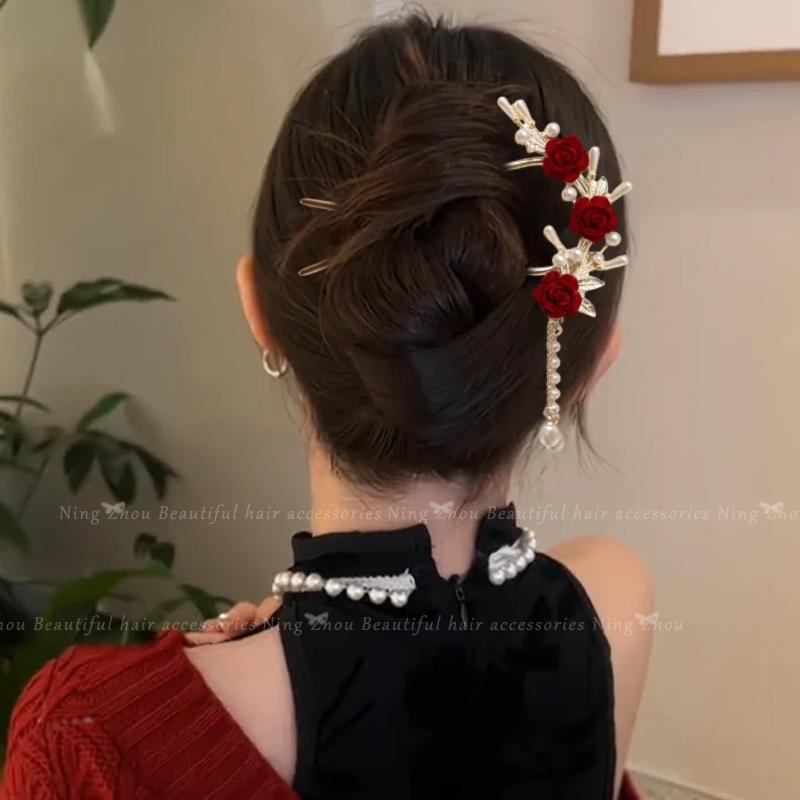 かんざし おしゃれ ヘアクリップ レディース レッド 花 モチーフ フラワー 結婚式 中華風 髪飾り 大人式 和装髪飾り