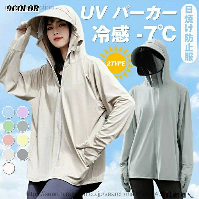 UV パーカー 冷感 -7℃ レディース 長袖 ラッシュガード 遮光 つば UVカット アウター 2タイプ 通気口 指穴 取り外し サンバイザー 日焼け防止服