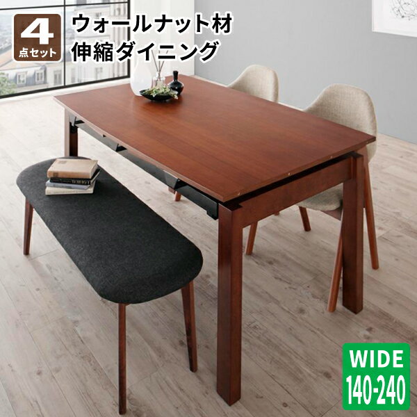 ダイニングセット 4点セット(テーブル+チェア2脚+ベンチ1脚) W140-240 食卓セット 伸縮テーブルチェアセット ダイニングテーブルセット 伸長式 4人掛け 北欧 北欧テイスト 天然木ウォールナット材 (KANA カナ) 送料無料