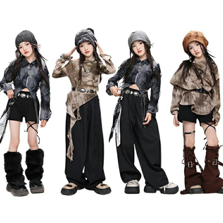 キッズダンス衣装 廃土風 y2k パンク ダメージ セットアップ ヒップホップ ブラウン 茶色 黒 グレー ダイダイ柄 トップス 長袖 へそ出し ズボン コーヒー色 プリーツスカート 短パン K-POP 子供 ジャズ チアガール 女の子 韓国 Hiphop 派手 おしゃれ 発表会 衣装 jazz
