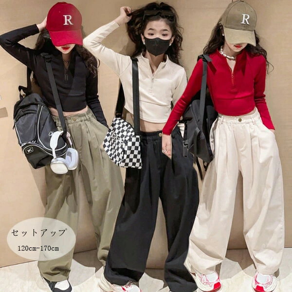 子供服 セットアップ キッズ 女の子 秋服 新品 上下セット ジュニア服 普段着 通学着 運動着 長袖 立ち襟 トップス 長ズボン ワイドパンツ ガールズ カジュアル 春秋 新品 ファッション ブラック ページュ レッド 120 130 140 150 160 170