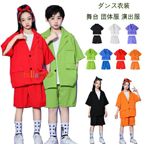 キッズダンス衣装 フォーマル スーツ 女の子 男の子 発表会 舞台 団体服 演出服 子供ダンス 半袖ブレザー+ショートパンツ 学生 文化祭 学園祭 応援団 スーツジャケット 半ズボン 韓国 K-pop ダンスウェア ブラック ホワイト パープル グリーン ブルー レッド オレンジ