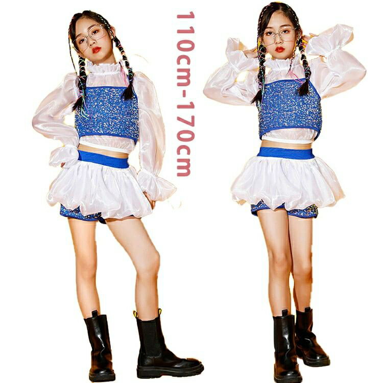 ガールズ ヒップホップ 衣装 青 白 K-POP 韓国 子供ダンス服 ダンスウェア ダンスレッスン着 へそ出し トップス パンツ スカート キッズダンス衣装 男の子