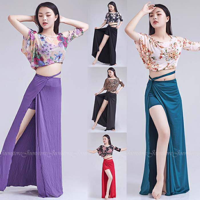 ベリーダンス レッスン着 練習着 衣装 セット 花柄 ヒョウ柄トップス ロング丈 ヒップスカーフ スカート 上下セット ベリーダンス衣装 レッスンウェア ダンスウェア レディース ステージ衣装 舞台衣装 社交ダンス ダンスウェア 全5色