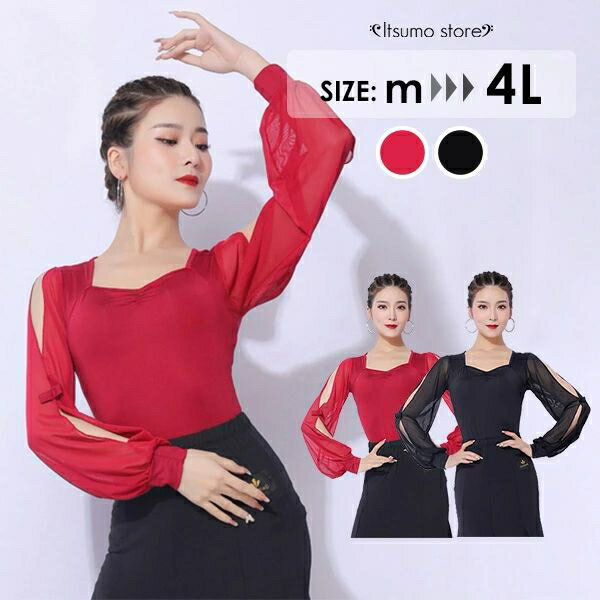社交ダンス トップス 女性 社交ダンス衣装 上着 レディース 透け感あり 練習着 競技着 ダンスウェア 競技ダンス レッスン ラテンダンス モダンダンス 発表会用 黒 レッド 赤 ボリューム袖 肌見せ ワルツ チャチャチャ ステージ 演出着 ダンストップス M L XL 2XL