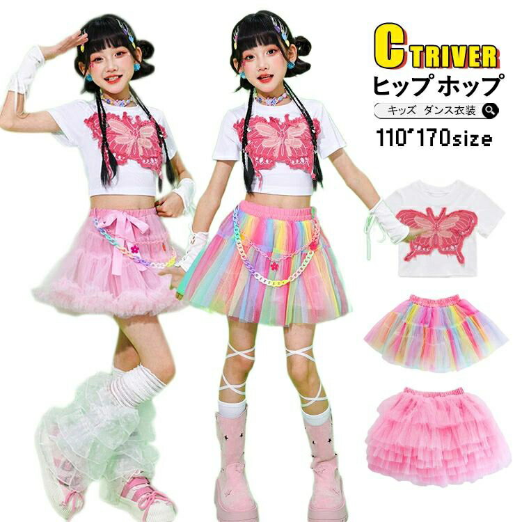 キッズ へそ出し トップス ダンス衣装 女の子 セットアップ 蝶トップス 白 tシャツ チュールスカート ピンク ジャズダンス 韓国