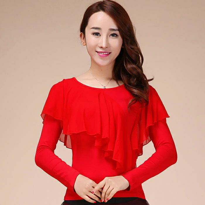 社交ダンス トップス 胸元フリル 長袖 レッスン着 レッスンウェア ラテン モダン ダンスウェア 社交ダンス 衣装 練習着 コーラス衣装 無地 ダンス着 社交ダンス 衣装 レッスン 練習着 レディース