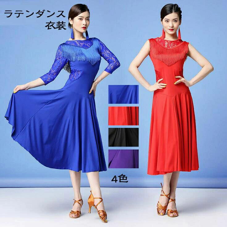 ダンス衣装 ロング丈ダンスドレス ラテンダンス衣装 社交ダンス モダンダンス ラテンドレス ワンピース レース ダンスウェア フリンジ 七分袖 袖無し ノースリーブ ラテン競技着 ステージ衣装 ダンス発表会 余興 4色
