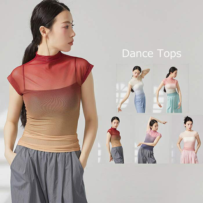 グラデーション ダンス衣装 トップス シースルー メッシュ 半袖 ダンストップス 薄手 レディース 大人 ダンス 衣装 レッスン着 動きやすい 発表会 練習着 演出用 エレガント バレエ ヨガ ダンスウェア 美しい おしゃれ ピンク ブルー グリーン パープル レッド