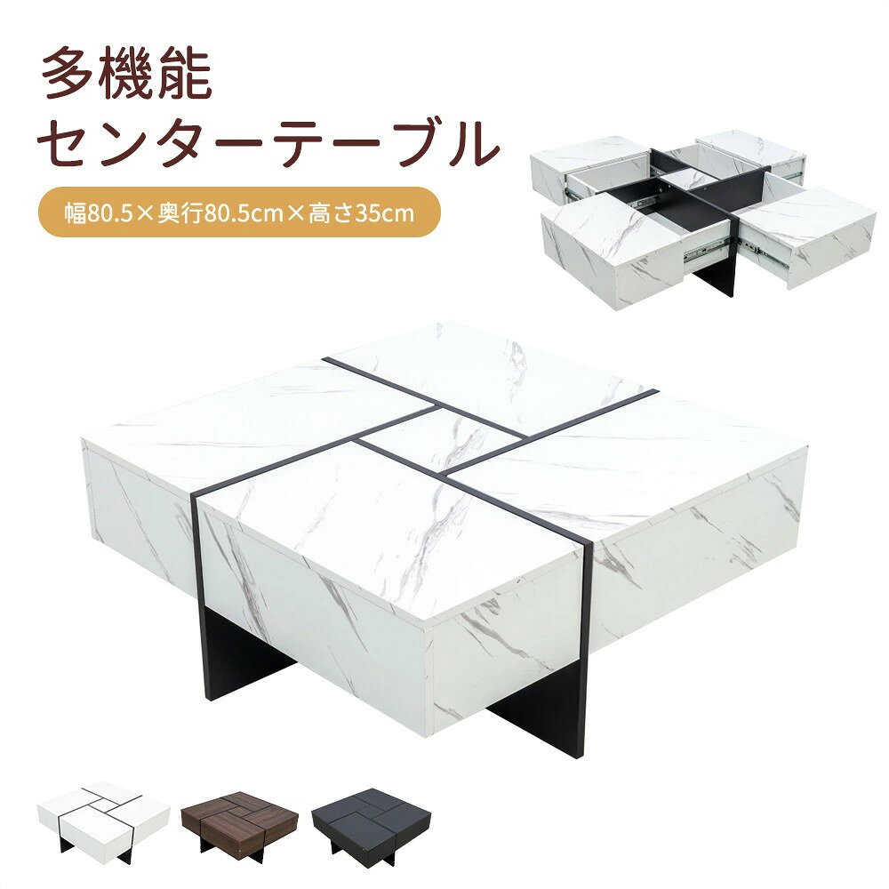 【大容量収納】センターテーブル 収納付き 正方形 大きめ 幅80.5 ローテーブル ロータイプ 隠す収納 引き出し付 収納 大理石調 木目調 テーブル コーヒーテーブル リビングテーブル 食卓テーブル おしゃれ コンパクト 高級感 一人暮らし HINCES