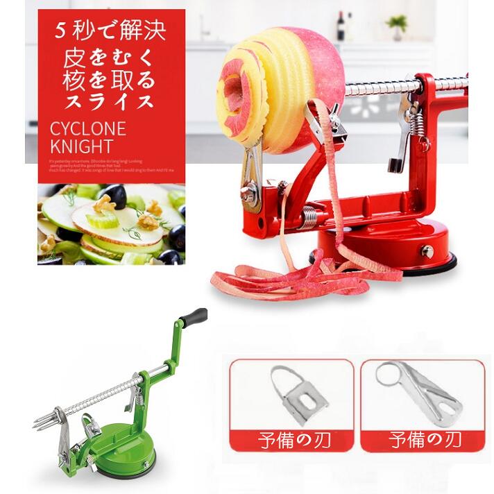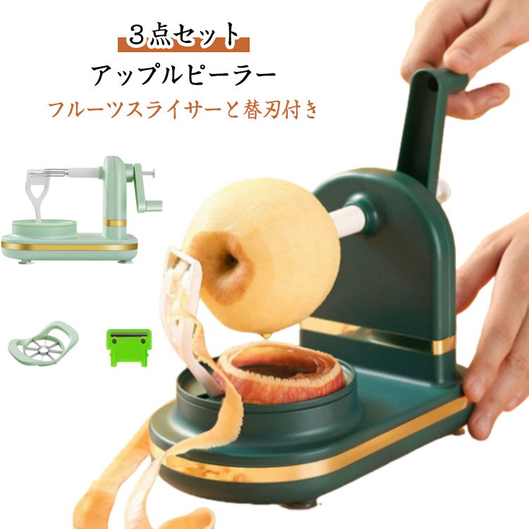 アップルピーラー 手動式 3点セット 果物削り 回転式 皮むき器 フルーツスライサーと替刃付き 果物 ピーラー 回転式ピーラー フルーツピーラー ハンドルを回すだけ 半自動