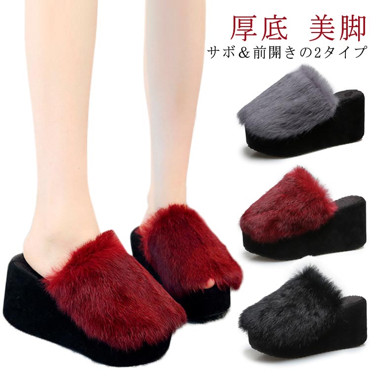 美脚 レディーズ 美脚 ファーサンダル ウエッジヒール あったか ふわふわ ミュール ファーサンダル フラットサンダル 歩きやすい ラビットファー おしゃれ シューズ シューズ カジュアル お出かけ 春 秋 冬 厚底サンダル