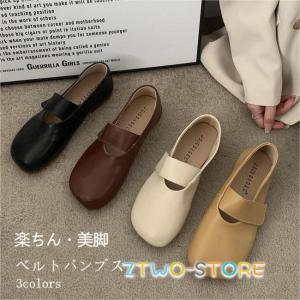 ベルトパンプス フラット底 レディース ローファー スクエアトゥ フラットシューズ レトロ パンプス マジックテープ 歩きやすい 痛くない
