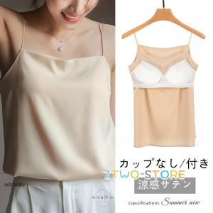 カップ付きタンクキャミ ブラトップ キャミソール サテン サテンキャミソール ブラ レディース ブラ不要 ナローストラップ 立体カップ シルクタッチ カップなし