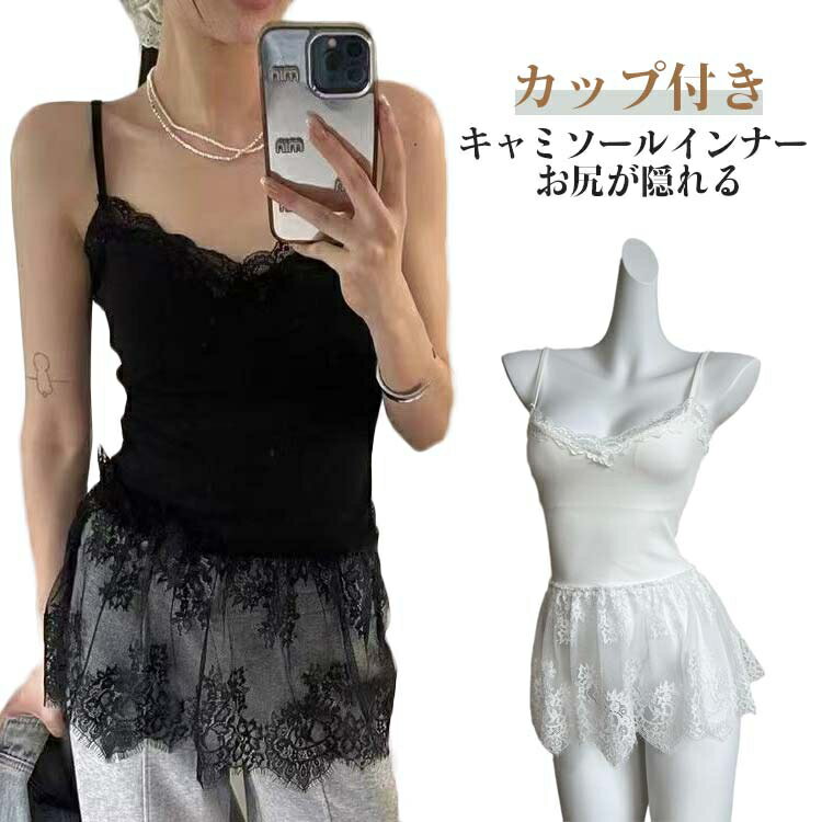 体型カバー カップ付き キャミソール トップス 裾フレア 重ね着 レイヤードキャミソール レース ロング丈 Vネック レイヤード お尻が隠れる キャミ インナー 付け裾 キャミソール レース切り替え 黒 白 春 秋 冬 タンクトップ レディース ロングキャミソール 綿