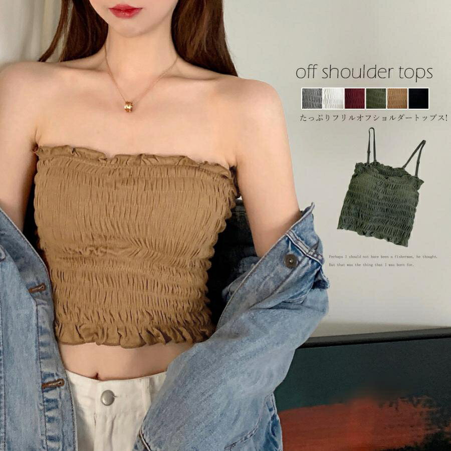 チューブトップ ベアトップ レディース ストラップ付き インナー ストレッチ 韓国ファッション フリル トップス ギャザー飾り