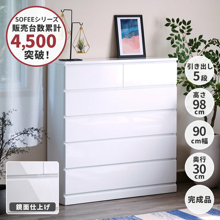チェスト タンス マルチ収納 リビング収納 幅90 奥行30 引出し 収納家具 衣類収納 木製 エナメル 鏡面 白 ホワイト リビング 寝室 SOFEE CHEST 90-5 (WH) ISSEIKI