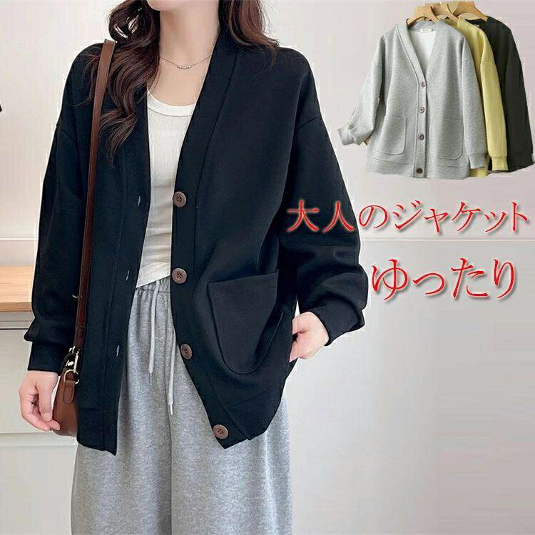 スタジャン レディース ジャケット ノーカラー 長袖 アウター 秋 大きいサイズ ジャケット スウェット カーディガン ショート丈 Vネック 上着 シンプル 体型カバ