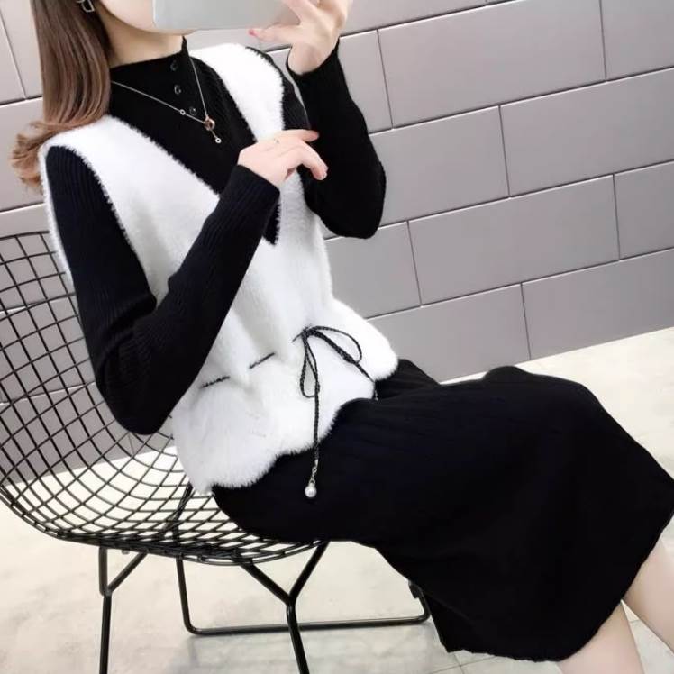 【P2倍&クーポン有】 レディース トップス ニット 襟なし セーター ふっくら シンプル ラフ 袖なし もこもこ ガーリー カジュアル かわいい ふわふわ 伸縮性 上品 こなれ感 ウエストマーク ベスト Vネック おしゃれ 大人可愛い きれいめ ミッドレングス