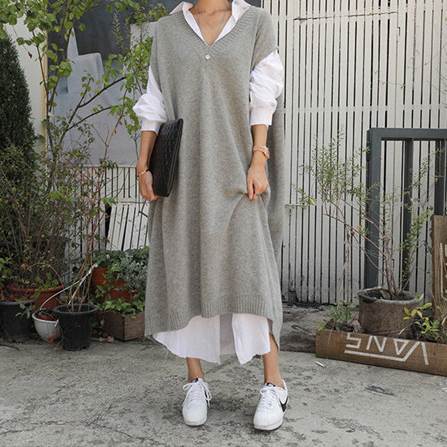 【P2倍&クーポン有】Vネック ニット ベスト トップス レディース ノースリーブ 秋 冬 普通丈トップス 袖なし 襟なし ストレート グレー 灰色 無地 フリーサイズ 学校 旅行 重ね着しやすい スニーカーコーデ 普段使い 楽ちん 送料無料 着回し コーディネートしやすい