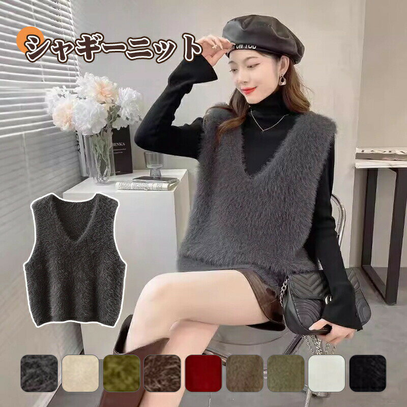 シャギー ベスト ニットベスト レディース 秋冬 ラメ シャギーニット シャギーベスト ベスト ニット Vネック レイヤード シャギー ジレ トップス 毛足長め フェザーヤーン プルオーバー フェザー きれいめ 黒 グレー 秋 冬