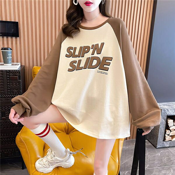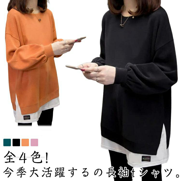 トレーナー ロングT ラウンドネック 重ね着風 ロング丈 Tシャツ トップス レディース 長袖 春服 秋服 ゆったり 大きサイズ レイヤード