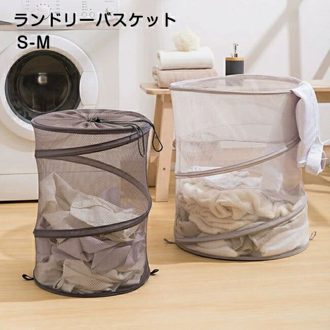 ランドリーバスケット 折りたたみ メッシュ 巾着フタ付き 自立式 収納ボックス 洗濯カゴ ランドリー収納 簡易バケツ 省スペース 持ち運び便利 コンパクト 収納 衣類収納 雑貨収納 おもちゃ収納 大容量 ランドリー 隙間 収納 Mサイズ 送料無料