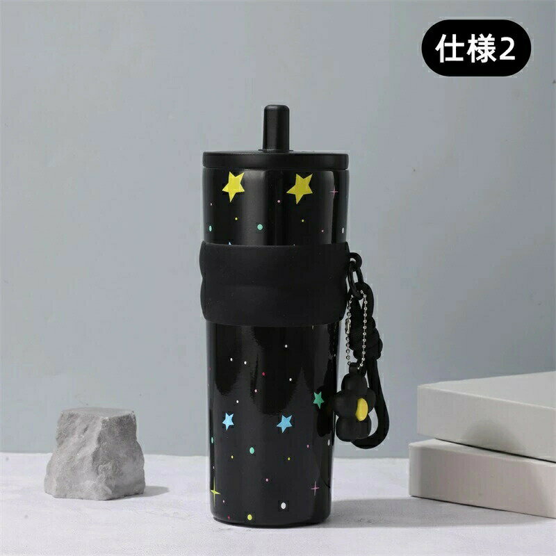 蓋・ストロー付き 保温保冷タンブラー ステンレス製 再利用可能 漏れない ウォーターボトル ストラップ付き 旅行用 ポータブルコーヒーカップ