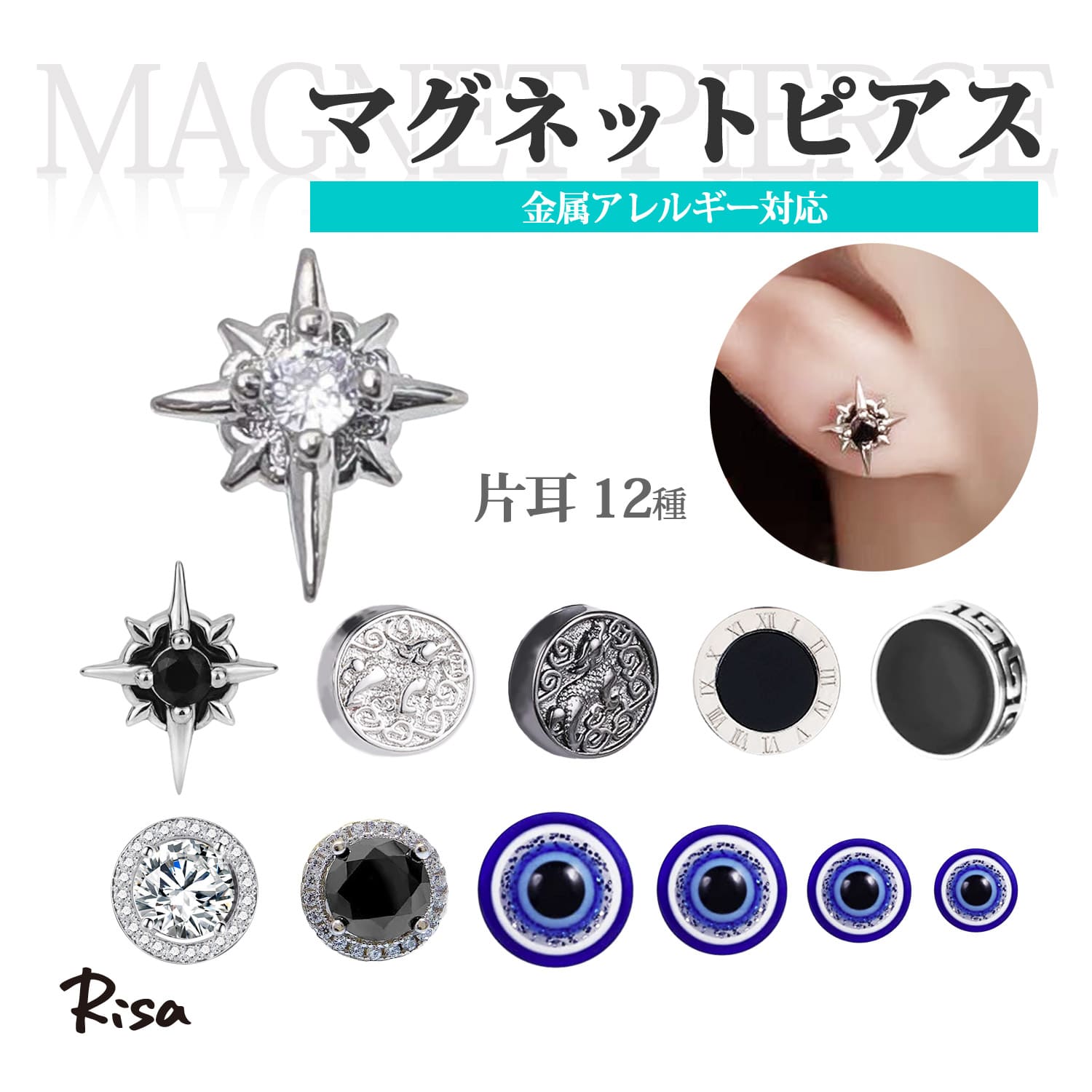 マグネットピアス メンズ ノンホールピアス 金属アレルギー対応 片耳 一粒ジュエル 目玉 ラウンド 龍 ローマ数字 ニッケルフリー レディース 穴あけ不要 磁石ピアス ハロウィン