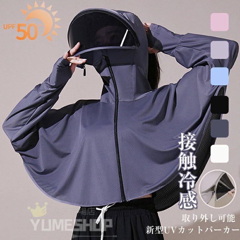 uv パーカー 指穴 uvカット パーカー サンバイザー 首元 UPF50+ ひんやり 接触冷感 UV ジップアップ ラッシュガード レディース フード